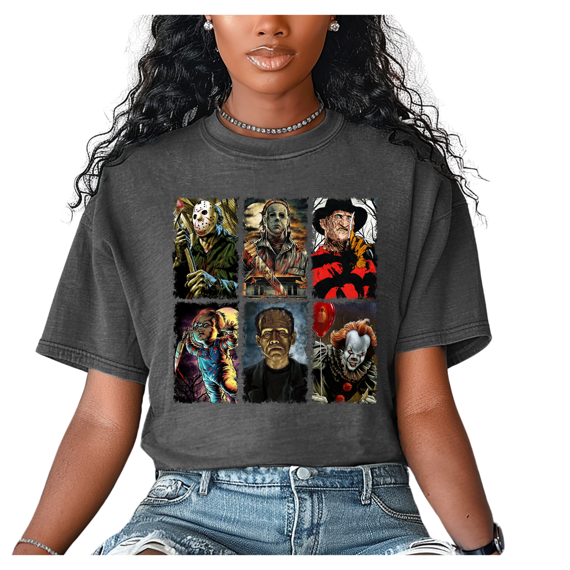 Get ready to make a scare! This design is perfect for horror movie lovers, featuring iconic characters like Jason, Michael Meyers, Freddy, Chucky, Frankenstein, and Pennywise. Don't miss out on this killer shirt!